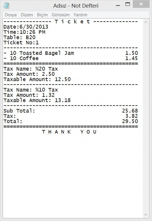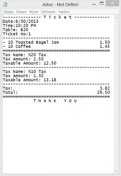 You can improve this configuration for your needs. For example you'll notice there is no tag for “Tax Excluded Sum”. Experienced SambaPOS users knows that can be added easily by using Printer Template Expressions. I'll add this line before printing Ticket Total.