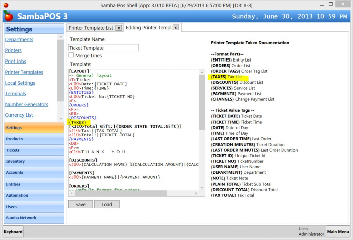 To enable printing taxes we have to create a section for taxes. As shown on the tag list we need to add {TAXES} tag for marking the point we want to list taxes and [TAXES] tag for format.
