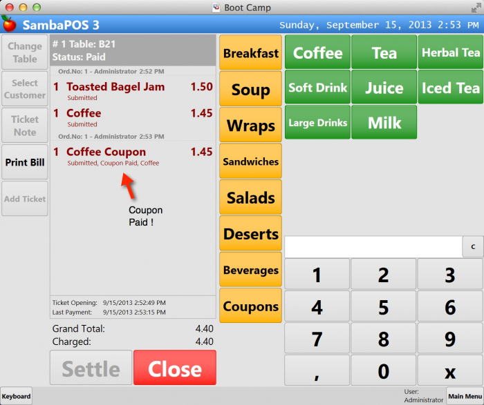 So create a new ticket now, add Coffee Coupon product and settle that ticket. When you open this ticket from ticket explorer, Order State of the Coffee Coupon product should be “Coupon Paid”.