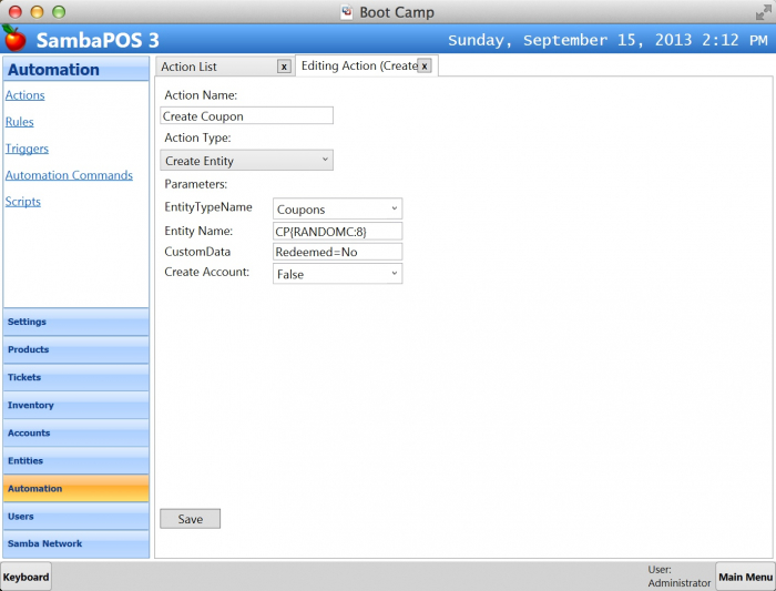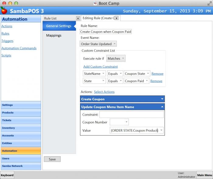 I’ve created two constraints to determine ordered Coupon is paid. If constraints are true it executes Create Coupon action to create a coupon entity. After creating that it executes second action to update coupon’s menu item name. As you have noticed I’m reading Menu Item Name from Order State by using {ORDER STATE:X} tag. You’ll remember we are using same tag in printer templates to print order states.