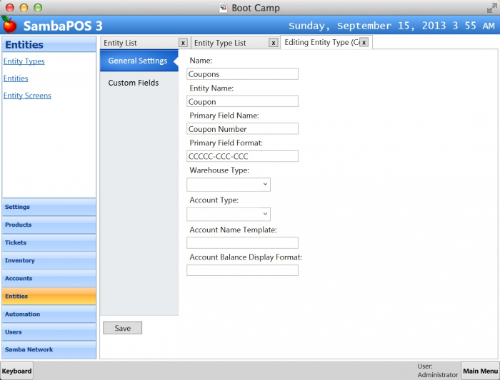 Entity Type Name is Coupons since we need to create a coupon entity. Entity name should be CP{RANDOMC:8}. {RANDOMC:8} tag is a Random Number Generator Tag that generates a 8 digit random number with check digit. So it becomes 9 digits. We also want to prefix Coupon Numbers with CP letters to be able to understand this random number is a coupon number. Finally Custom Data field contains Redeemed=No value to define default Redeemed field value.