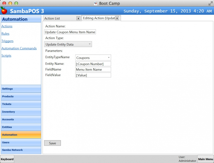 We’ll need actions to update Coupon custom fields. For example we have to change Redeemed value to “Yes” when coupon is used in a ticket. Let’s create a new action to update Coupon Menu Item Name.