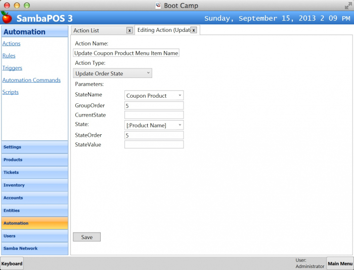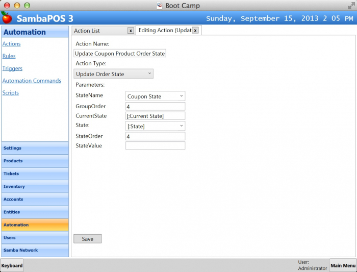 So when we sell Coffee Coupon we’ll create a new Coupon entity. For this reason we need to handle Order Added event to understand if Coffee Coupon is added to ticket. However we need to solve an issue here. We can’t create coupon entity as soon as Coffee Coupon product added to ticket because user can cancel it after printing Coupon to generate free coupons. We need to create coupons when ticket gets paid. We can use Order Status feature to determine if Coffee Coupon Product is paid or not. When we first add Coupon Product we’ll change order state to Coupon Ordered and when Ticket Paid we’ll change it to Coupon Paid. SambaPOS generates additional events when an order status is changed so we can understand Coupon is paid. Let’s create needed actions to update order states.