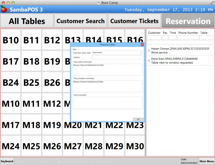 So you can execute ReservTable command as you create tasks to change Reserve state of the tables. On sample screen shot we have a Entity Grid widget that displays reservation state of tables. So if you type a table name while creating the task it appears on different color.