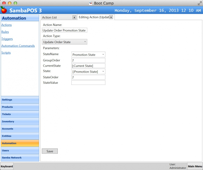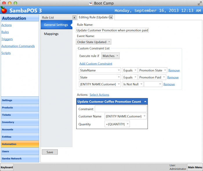 We’ll use Update Order State action to change Promotion State of the order. When we add a new Coffee Order it’s order state should become Promotion Ordered. When ticket paid we’ll update it to Promotion Paid and we’ll update Customer Data. Now we’ll create a rule to mark Coffee orders as promotion.