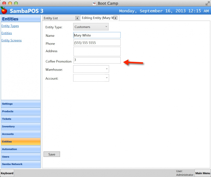 On previous New Customer promotion document we’ve used Entity State feature to store if customer is a new customer or not. For this sample we can also use Entity State to store Coffee Promotion data because Entity States can also store numbers. If you want to make it editable through customer card use custom fields. If no use Entity States.