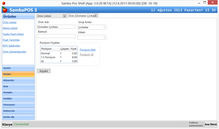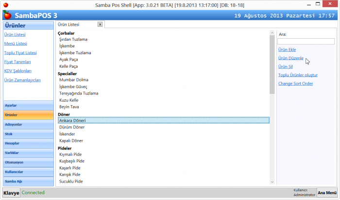SambaPOS içerisinde ürün tanımlada herhangi bir kısıtlama yoktur. İstediğiniz kadar ürün açabilirsiniz. Ürünl bilgileri üzerizde herhangi bir düzenleme yapacağınız zaman Yönetim >Ürünler >Ürün Listesi menüsüne gelinir. Ürün Listesi ekranında SambaPOS' a kayıtlı bütün ürünler listelenir.Bu ekranda düzenleme yapmak istediğimiz ürünü bulup üzerine tıklayayıp, sağ menüde bulunan Ürün Düzenle linkine tıklayarak ürünün detay sayfasını açarız.