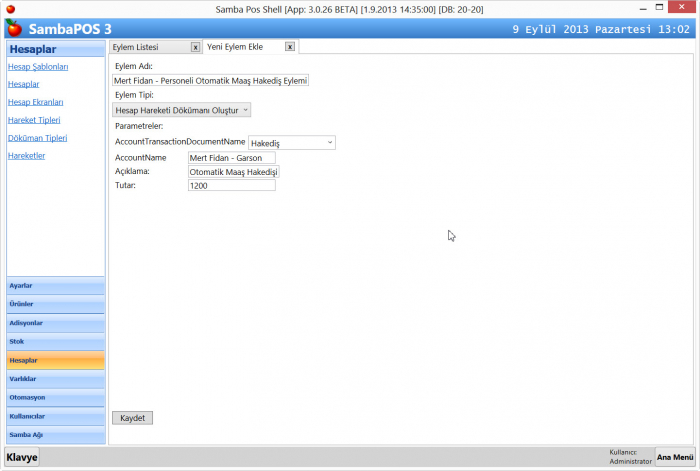 | Tutar | Hesabın alacaklandırılacak veya borçlandırılacak tutarıdır. Direk rakam olarak girilebileceği gibi başka eylemler sonucunda oluşacak bir değişken değeri de verilebilir. |