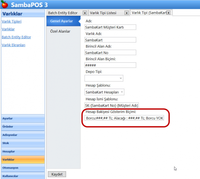 Bunun için ilgili Varlık Tipinde Hesap Bakiyesi Gösterim Biçimi alanını nasıl bir formatta gösterim istediğinize dair düzenlemeniz gerekiyor.