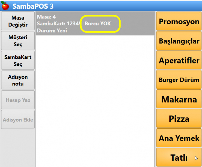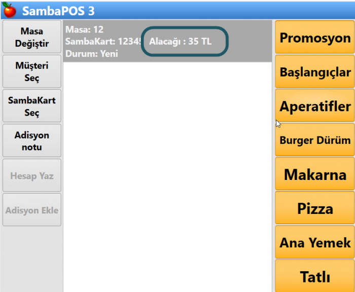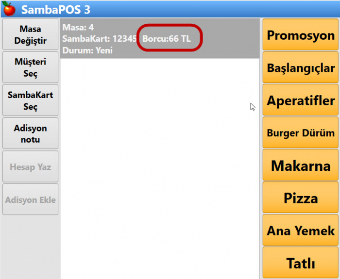 Müşteri açık hesap ile çalışıyorsanız veya SambaKart uygulaması benzeri bir promosyon uygulaması kullanıyorsanız, Adisyonun üst başlığında geçen müşteri bilgisinin yanında borç alacak rakamlarını görebiliyoruz.