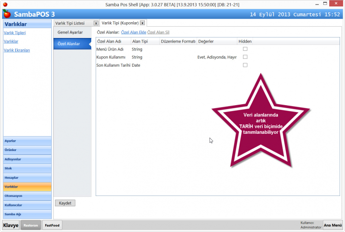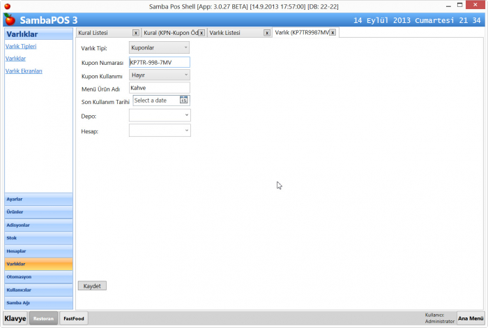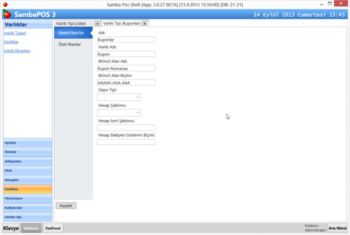 SambaPOS içerisinde üreteceğimiz kuponların her birini otomatik olarak oluşturacağımız birer Varlık olarak tanımlayacağız. Bunun için Özel alanlarını ve isteklerimizi karşılayacak yeni bri varlık tipi tanımlıyoruz.