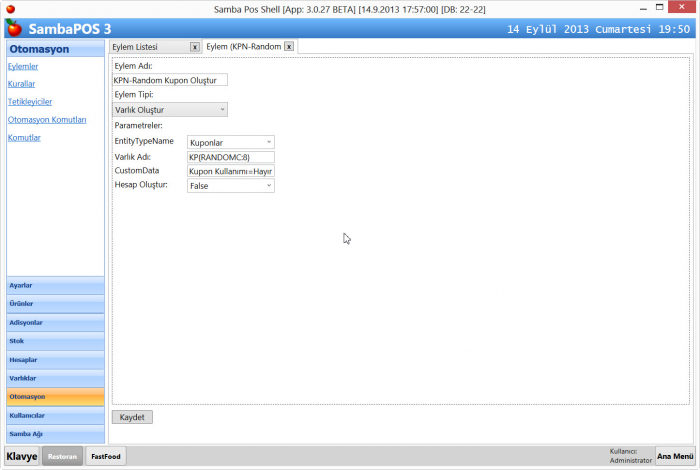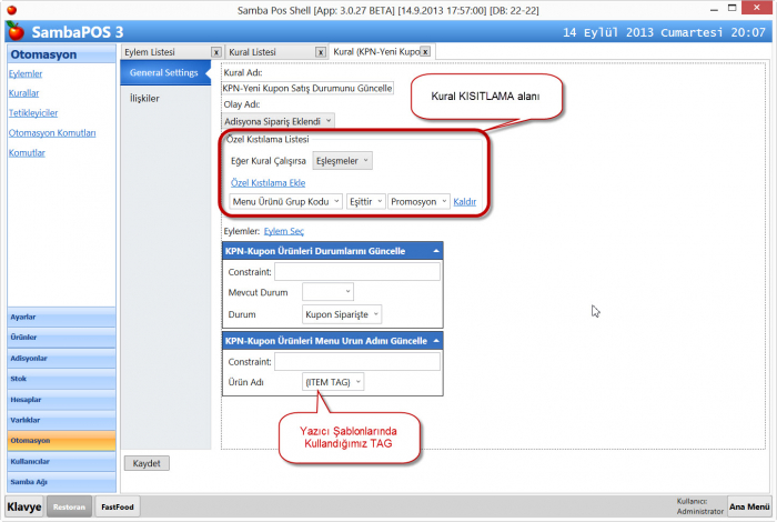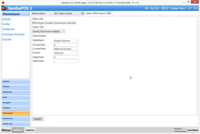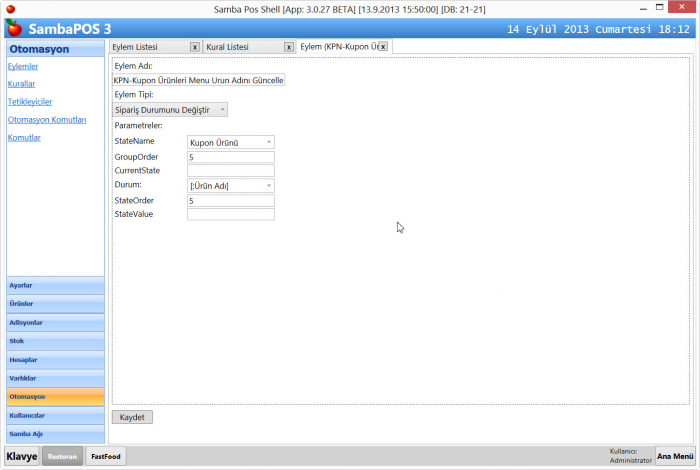 Bu Eylem çalıştığında, (adisyona ürün eklendiğinde) Kupon Durumu adında yeni bir State (Durum) tanımlayacak ve bunu ürünün altında 4 sırada nın 4 değişkeni olarak yazacağını tanımladık. [:] içerisinde girdiğimiz Mevcut Durum ve Durum değişken olarak bu eylemi çalıştıran kural tarafından atanabilecekler.