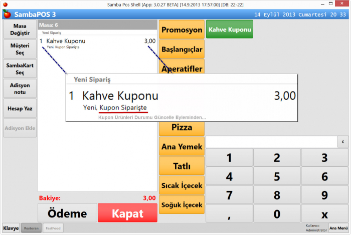 Kuralımızı tanımladıktan sonra adisyona, bir Kahve Kuponu ürünü eklendiğinde aşağıdaki gibi görülecektir.