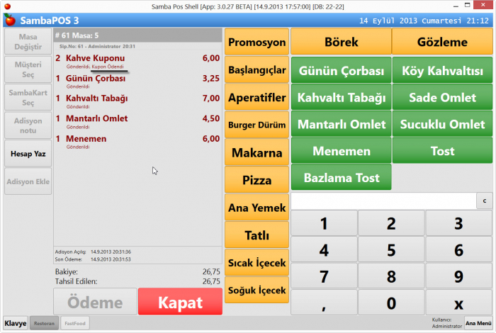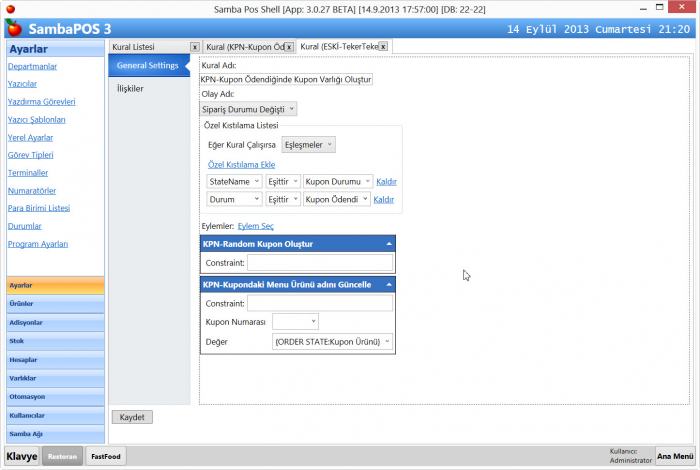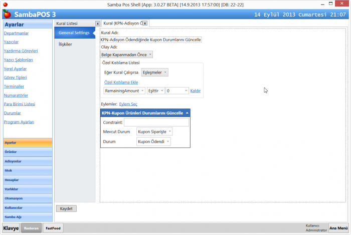 Kupon Ürününü adisyona eklediğimizde olması gereken durumlarını bir önceki kuralımızda tanımladık. Şimdi de bu adisyon ödediği zaman bu kuponun Durumlarının değiştirilmesi gerekiyor. Çünkü ileriki aşamalarda Ödemesi tamamlanmış Kahve Kuponları için Barkod yazdırmak dahil yapacağımız işlemlerde kullanacağız.