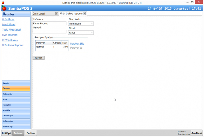 Ürün tanımlama SambaPOS da Yönetim - Ürünler - Ürün Listesi menüsünde Ürün Ekle linkine tıklanarak tanımlanır.
