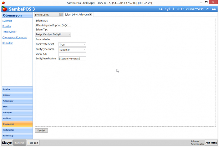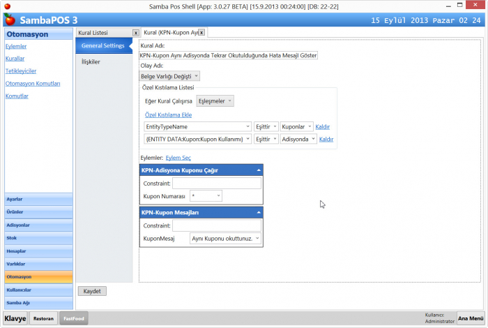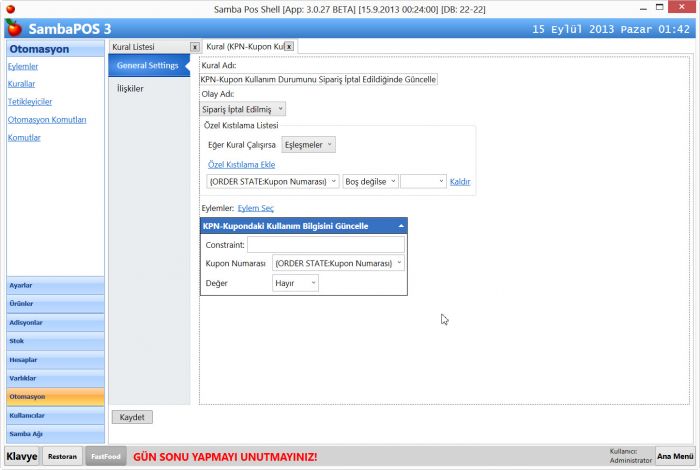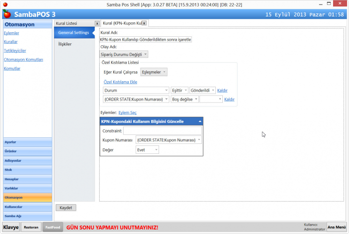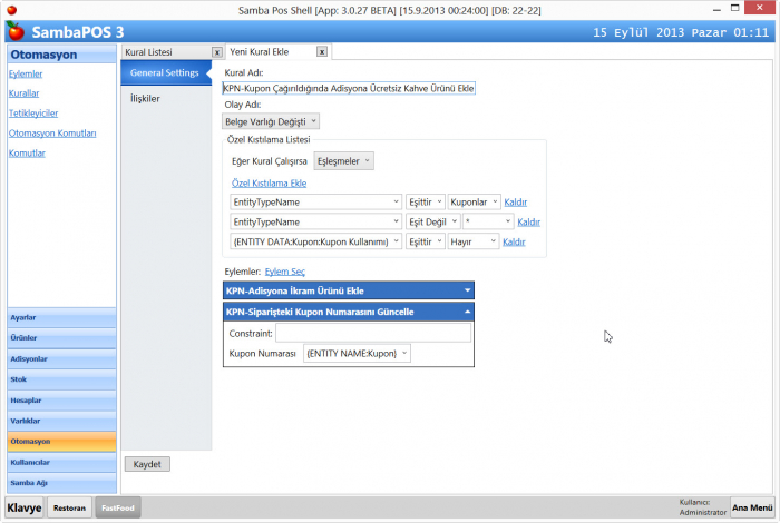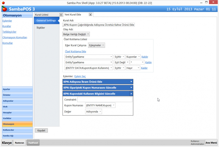 Bu eylem ile ilgili Kural tarafından çalıştırıldığın da halihazırdaki adisyonumuzun varlığını Kuponumuzun varlığı ile değiştirme işlemini yaptırıyoruz.