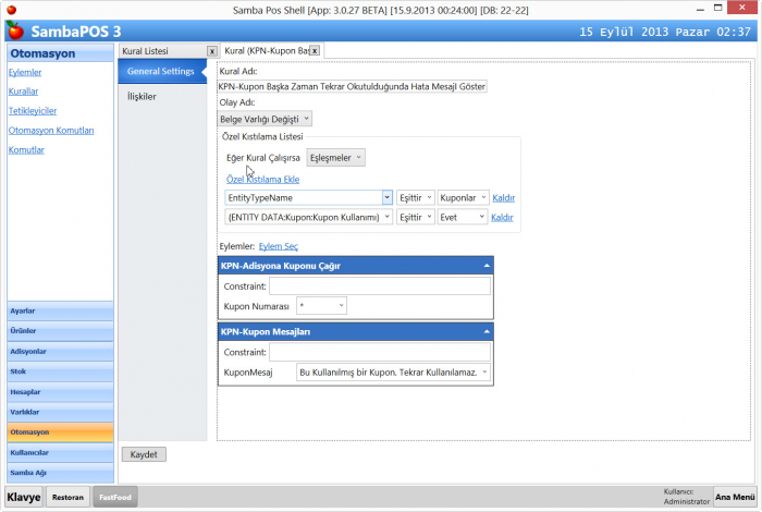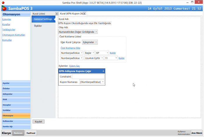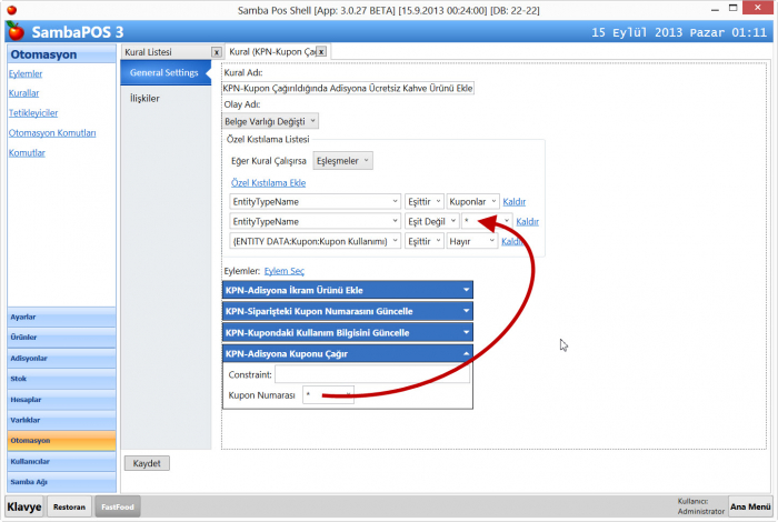 Özel Kısıtlama alanında illa Eşit olmasını istediğimiz 2 farklı değer verdik. Buna göre çağırılan Kuponların isimleri mutlaka KP ile başlamalı ve kupon adının uzunluğu tam olarak 11 karakter olmalıdır. Bu şartlar sağlandığı hallerde bu Kural yukarıda anlattığımız Adisyona Kuponu Çağır eylemini çalıştıracak ve bu eylemde Kupon Numarası değeri Numaratörden girilen isimli varlığı adisyona ekleyecek.