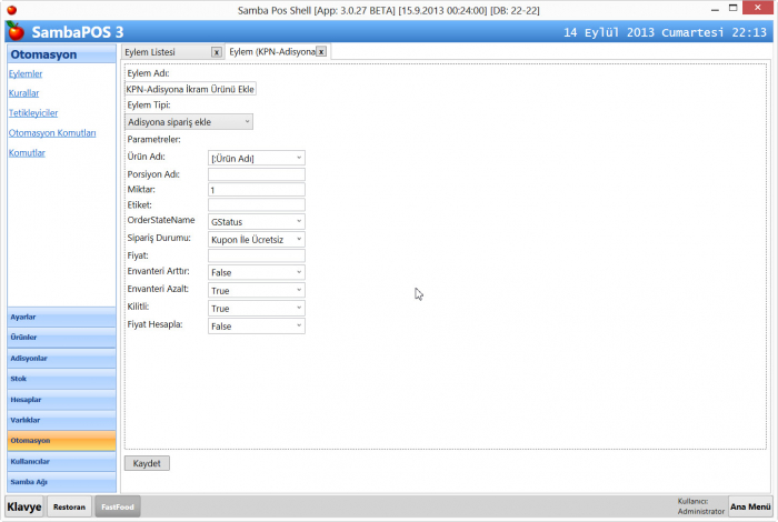 2.2. maddede oluşturduğumuz Adisyona ikram Ürün ekle kuralınını güncelleştirerek, bu eylemlerimizi orada çalıştıracağız.