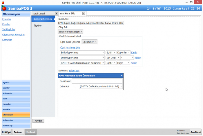 Bu Kural ile Belge Varlığı gerekli koşullarda değiştiğinde adisyona bir adet ikram Kahve ürünü ekleme işi yapacak olan kuralımızdır. Bu kuralı adisyona aşağıdaki diğer başka eylemlerde de kullanacağız.