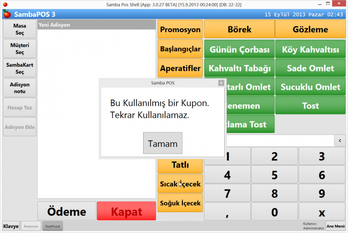 Bu Kural çalıştığında Kupon Kullanım Durumu Adisyonda ise kullanıcının karşısına Aynı Kuponu Okuttunuz yazan bir mesaj çıkaracak.