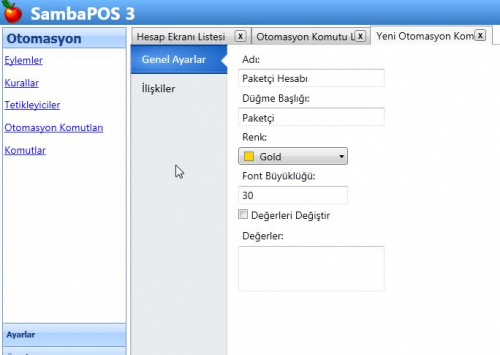 Bu komutumuzun sadece paket servis departmanında yada paket servis adisyon tipinde ve adisyon altındagözükmesini isteyeceğimiz için ilişkiler tabında ona göre düzenlemeyi yaparak bir ilişki eklememiz gerekiyor.