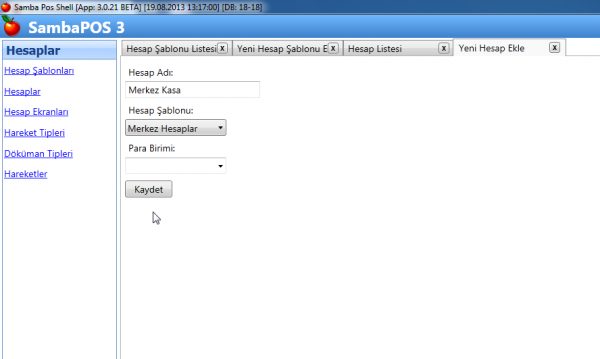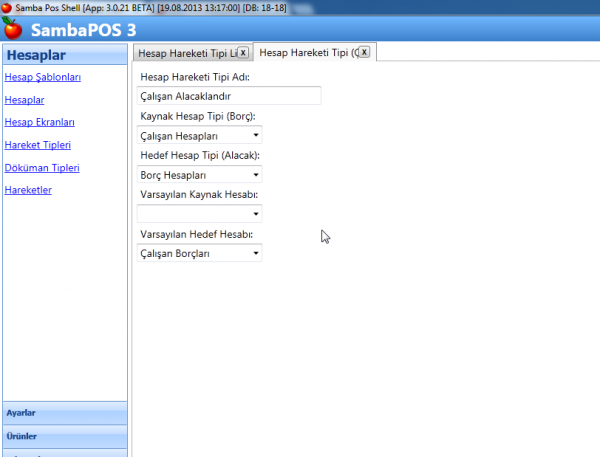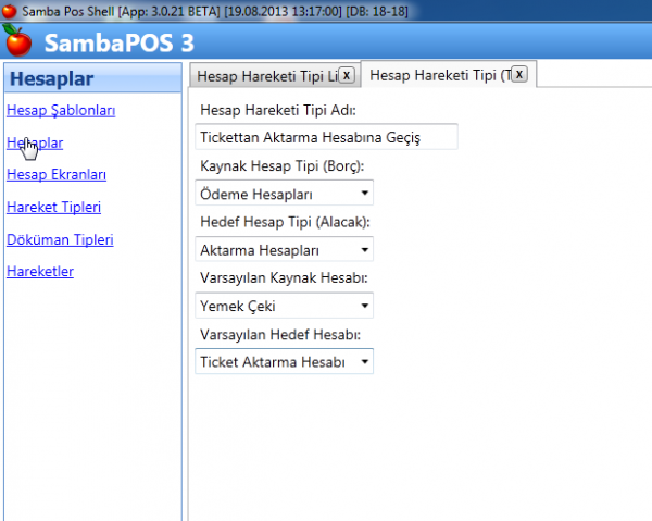 Aktarma Hesapları: Buraya pos hesaplarından yada ticket hesaplarından geçiş yapacağımız zaman kullanmak üzere ara hesaplar oluşturacağız. Çünkü SampaPOS güvenlik açısından aynı hesap şablonları altındaki bir hesaptan diğerine geçişe izin vermemektedir. Posdaki bakiyemizi nakite geçireceksek böyle bir ara hesap kullanacağız ancak posdaki bakiyemizi başka bir hesap şablonu altındaki patron hesabına geçireceksek böyle bir ara hesaba ihtiyacımız olmayacak. Kredi kartları için ayrı ticketlar için ayrı aktarma hesabı oluşturabiliriz bu bizim için takibi kolaylaştırır ama gerek yok diyorsanız hepsini tek bir hesap üzerindende yapabilirsiniz.