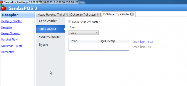 Hesap şablonu bölümüne hangi hesap şablonunun olduğu ekranda gözükmesini istiyorsak yada hangi hesap şablonundaki hesapların hesap detaylarında gözükmesini istiyorsak o şablonun adını seçiyoruz. Gider Hareketi için gider hesaplarını seçeceğiz çünkü hangi gideri yapacaksak onu seçmemiz gerekecek. Döküman tipi olarak gider hareketini seçiyoruz ve toplu oluştur tabına geçip toplu oluşturu seçiyoruz. Seçmezsek eğer her gider için ayrı ayrı hesap detaylarına girip oluşturmamız gerekir pek kullanışlı olmaz. Yinede sizin seçiminiz. Daha sonra ilişkiler tabına geçip genel bir ilişki ekleyeceğiz ve bundan sonraki oluşturulacak bütün döküman tipleri için ilişki eklenmesi gerekecek onlar için ayrı ayrı resim eklemeyeğim.