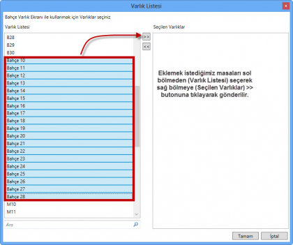 Varlık Listesi –> Varlıklar (Varlık Seç): Bu Varlık Ekranında gözükmesini istediğimiz masaları seçerek bu varlıkların içine ekleriz.