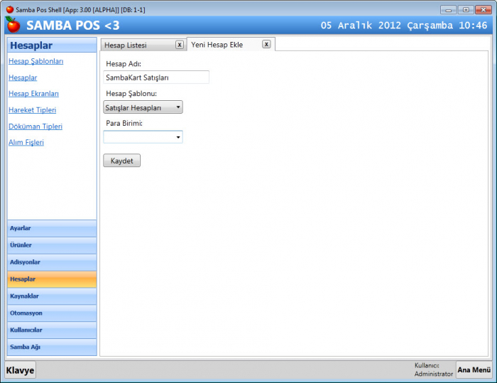 Müşterilere vereceğimiz ve alacaklı çalışan her bir kart için bu hesap altında bir hesap oluşacak. Bu kartlara para yüklemesi yapmak için yani kart hesaplarını alacaklandırmak için bir hesap hareketi tipi tanımlayacağız. Öncelikle bir kısa açıklama yapalım. SambaPOS hesap sistemi restoranlar için basitleştirilmiş bir hesap sistemidir. Çift kayıt esasına göre çalışır. Bu şu anlama geliyor. Eğer bir kart hesabı alacaklanıyorsa (yani karta para yüklemesi yapılıyorsa) başka bir hesabın da borçlanması gerekir. Bu sayede hesapların dengede kalması sağlanır. Bunun için öncelikle “Satışlar Hesapları” altına SambaKart Satışları isminde bir hesap tanımlayacağız. Doldurduğumuz her kart bu hesabın da borcuna yazacağı için toplam kart satışlarımızı da bu hesaptan takip edebiliriz.