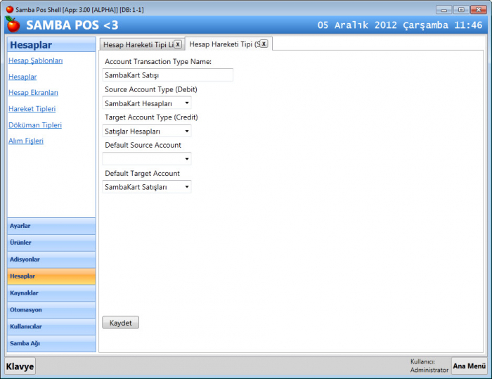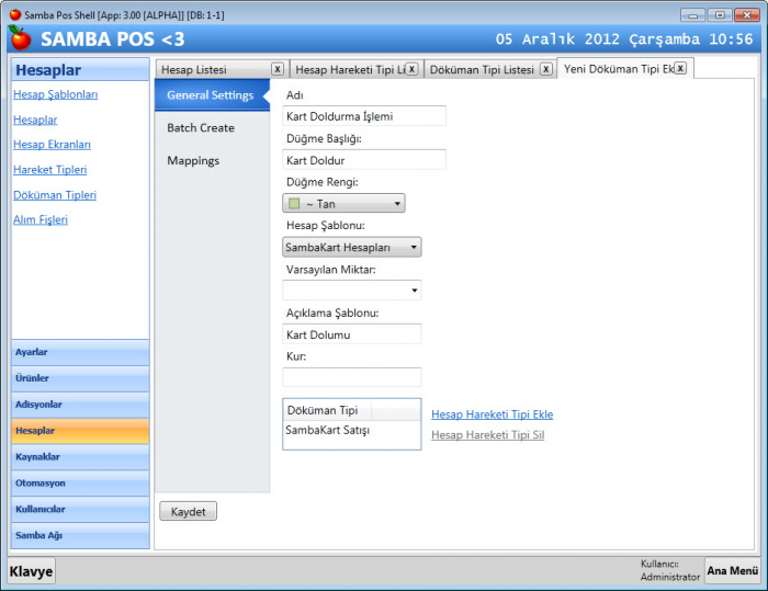 Böylece SambaPOS'a kart doldurma işleminin nasıl yapılacağını tarif etmiş olduk. Son olarak kullanıcının bu işi basitçe yapabilmesi için bir Döküman Tipi tanımlayacağız. Bu sayede bu hesap hareketleri otomatik olarak gerçekleştirilmiş olacak. Hesaplar > Döküman Tipleri menüsünden yeni bir döküman tipi tanımlıyoruz.