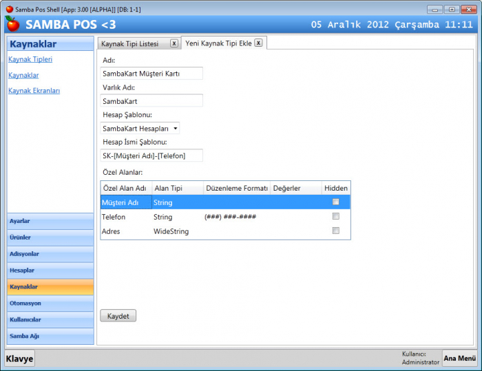 Masa, Müşteri gibi adisyonlara bağladığımız her şeye Varlık ismi verdik. Yani Adisyonda seçmek istediğimiz herşeyi bir Varlık Tipi olarak tanımlayabiliriz. Adisyonda SambaKart seçimi yapabilmek için öncelikle Varlıklar> Varlık Tİpleri ekranından yeni bir Kaynak Tipi tanımlayalım.