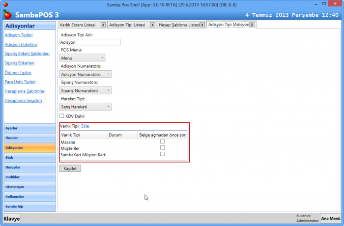 Açtığımız adisyonlarımızın içerisinde SambaKart Seç butonun gelmesi için Yönetim > Adisyonlar > Adisyon Tiplerinde kullandığımız Belge tipinin içine girerek Varlık Seç linkine tıklayarak yukraıda tanımladığımız, SambaKart Müşterisi Varlık Tipini de ekliyoruz.
