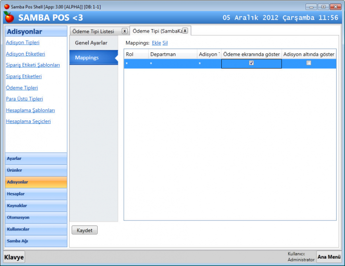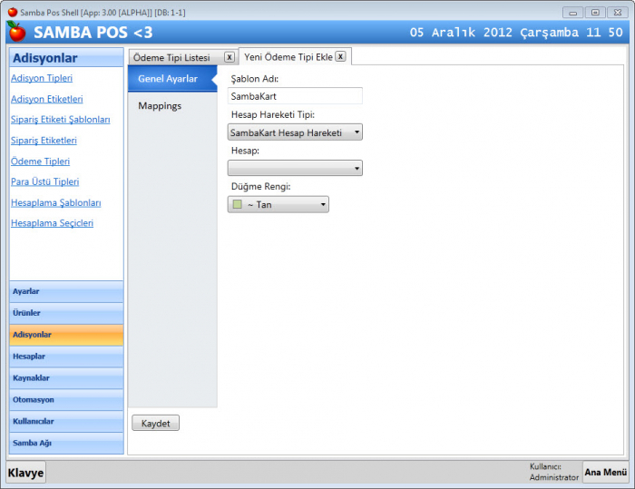 Bu ekranda yaptığımız tanıma göre ödeme tipi düğmemiz SambaKart olarak ve yeşil renkte görüntülenecek. Hesap Hareketi Tipi olarak da biraz önce tanımladığımız SambaKart Hesap Hareketini seçiyoruz. Yine Mappings sayfasına geçerek bu düğmenin nasıl görüneceğini tanımlayalım.