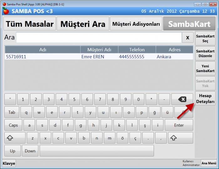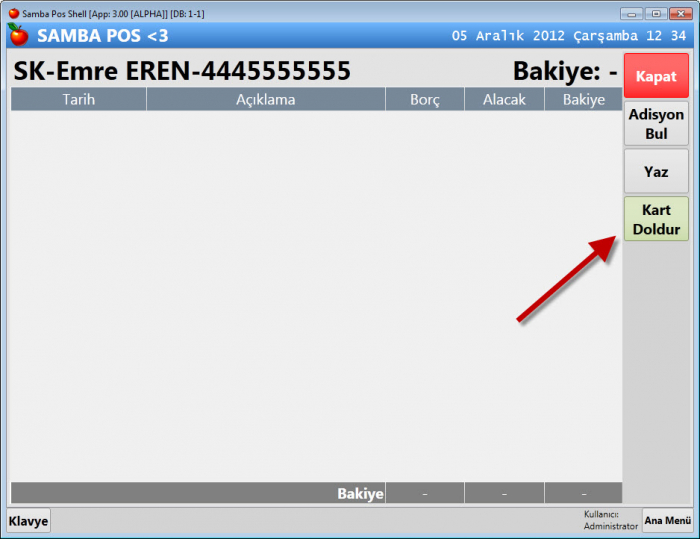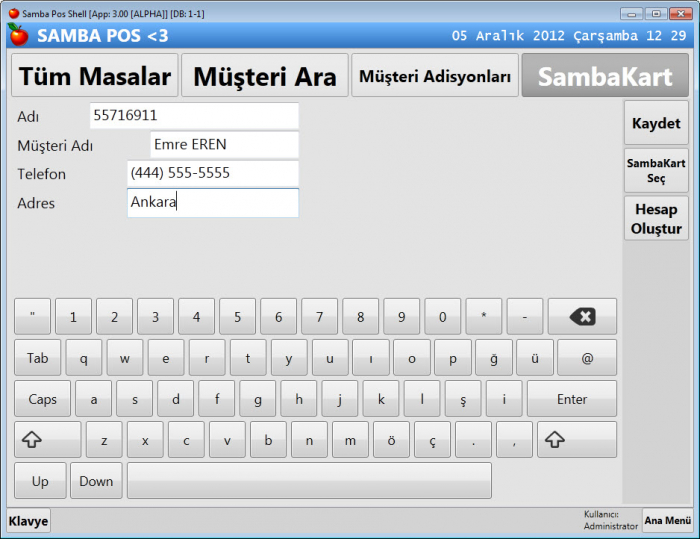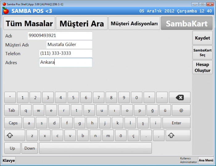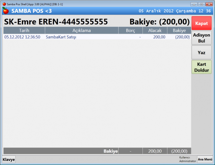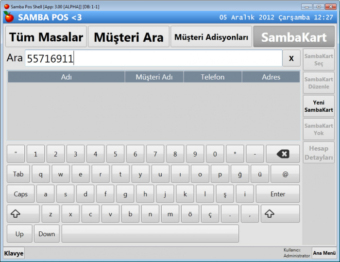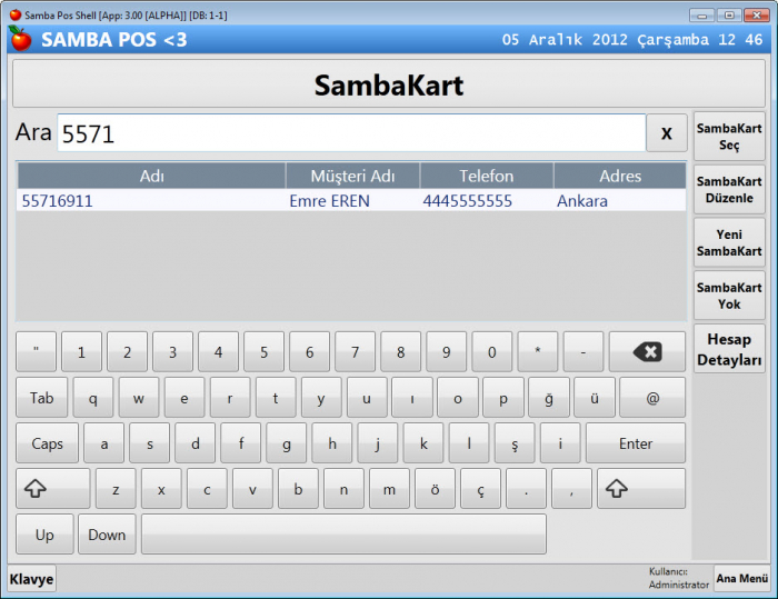 POS ekranımıza SambaKart isminde yeni bir ekran daha eklendi. Bu ekran tıpkı müşteri ekranları gibi çalışıyor. Kart ismi olarak kart numarası kullanacağız. Kart numarası olarak 55716911 girelim. Bu numarayı klavye emülasyonlu manyetik kart okuyucu kullanarak girebilmek de mümkün.