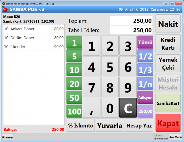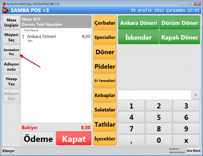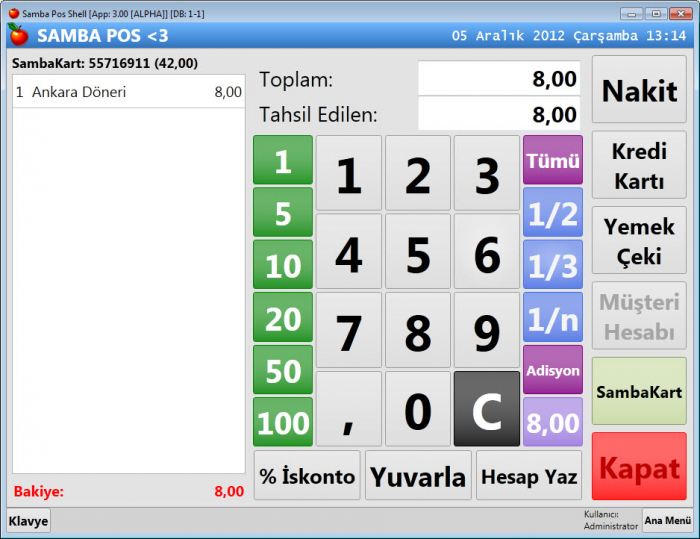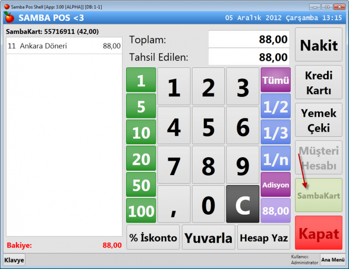 Ekranda göründüğü gibi 100 TL daha yükleyince kartımızın kredisi 42 TL oldu. Şimdi Kapat diyerek önceki ekrana göre dönüyoruz ve SambaKart Seç diyerek yeni bir adisyon açıyoruz.