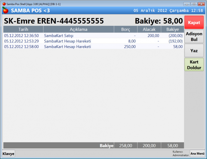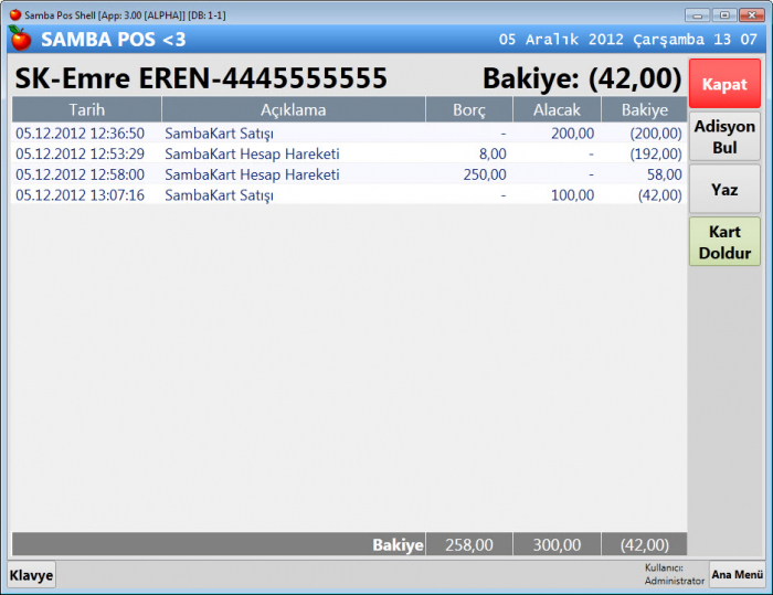 Bu kart üzerinde gerçekleşen tüm işlemleri bu ekranda göreceğim. Göründüğü gibi müşterimiz bize 58 TL borçlanmış oldu. Ön ödemeli kartlar için bu istenmeyen bir durum olabilir. Küçük bir ayar yaparak kartın borçlu duruma geçememesini sağlayabiliriz. Yönetim > Hesaplar > Hesap Şablonları ekranından SambaKart Hesapları'na çift tıklayalım.