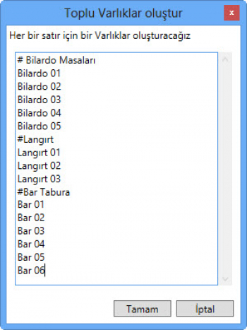 Açılan yazım alanı penceresi içine # işareti ile başlayan satırlar Varlık Tipini altlarında bulunan her bir satır ise o varlık tipine ait olan varlıkları bir seferde açmada kullanılır. Yukarıdaki gibi bir toplu varlık eklendiğinde liste ekranımız aşağıdaki gibi gözükür.