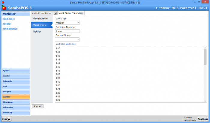 Görünüm Durumu: SambaPOS V3 ile birlikte gelen “Durum” yapısında bu Varlık Tipi için ayarlanmış ve kullnılmak istenen Durumun yazılacağı alandır.