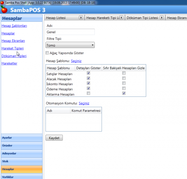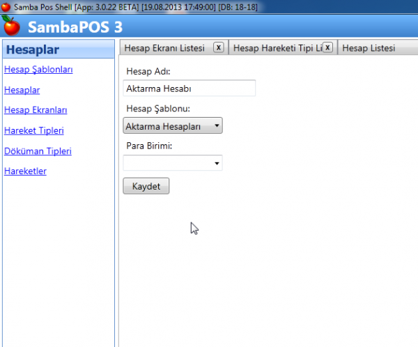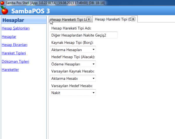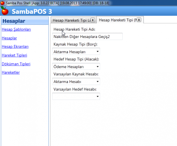 Yukarıda listelediğimiz her aktarma şekli için iki adet hesap hareket tipi ekleyeceğiz. Örneğin Nakitten kredi kartına geçiş yapmak için önce nakitten aktarma hesabına sonrada aktarma hesabından kredi kartına geçişi sağlıcak hesap hareket tiplerini tanımlayacağız. Dökümanda sadece biri için oluşturdum benzer şekilde 6 hareket için yoplam 12 tane oluşturmanız gerekmektedir.
