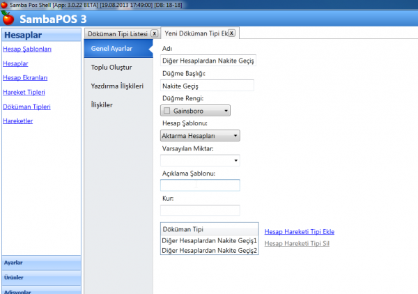 6 Aktarma çeşidi için yukardakine benzer şekilde 6 adet döküman tipi oluşturmamız gerekmektedir. Hesap Şablonu olarak aktarma hesabının seçili olması önemlidir aksi halde hesaplar kedi içlerinde aktarma yapacaktır ve sonuç olarak hesaplar arası aktarma gerçekleşmeyecektir. Hesap detaylarına girmeden oluşturabilmek için toplu oluştur seçili olmalıdır. Ve bu işlemi sadece admin yapmasını isteyeceğimiz için ilişkiler o şekilde düzenlenmelidir.