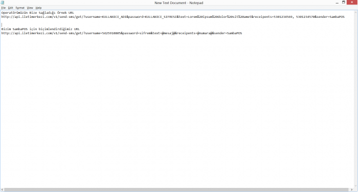 Operatörün bize sağladığı URL nin içerisinde yer alan text (Mesajın içeriğinin olduğu) alanı nı biz SambaPOS içerisinde tanımlayacağımız için @ işaretleri arasında bir değişken olarak tanımlıyoruz. Aynısını numara (Müşteri Telefon Numarası) içinde yukarıdaki gibi tanımladıktan sonra URL mizi kopyalarak kullanıma hazır bekletiyoruz.