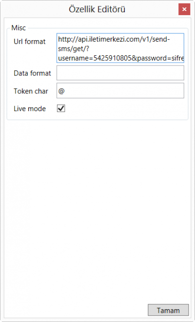 olarak seçtikten sonra URL Printer yanında bulunan Ayalar linkine tıklayarak SMS URL ayarlarımızı buradaki URL Format alanına yapıştırıyoruz. Token Char değerini yukarıda değişkenleri tanımlarken kullandığımız @ işaretiyle ekledikten sonra Live Mode linkini işaretleyerek kaydet butonuna tıklıyoruz.