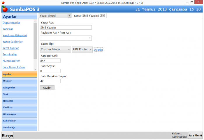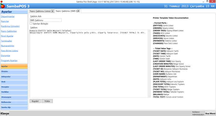 Bu şekilde yazıcı tanımalanması tamamlanmış oluyor. Sırada gonderecepimizi SMS in içeriğini belirlemeye geldi. Bunun için de yeni bir Yazıcı Şablonu tanımalamamız gerekiyor.