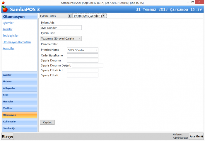 Hazırladığımız Yazdırma Operasyonlarımızın çalışabilmesi için, gerekli olan Yazdırma Görevi çalıştır eylemini ekliyoruz. Yönetim > Otomasyon > Eylemler menüsünden Yeni Eylem Ekle linkine tıkladıktan sonra Eylemimize uygun bir isim veriyor ve Görev olarakda “Yazdırma Görevi Çalıştır”ı seçtikten sonra Print Job Name kısmına tanımladığımız SMS Gönder yazdırma görevimizi seçerek eylemimizi kaydediyoruz.