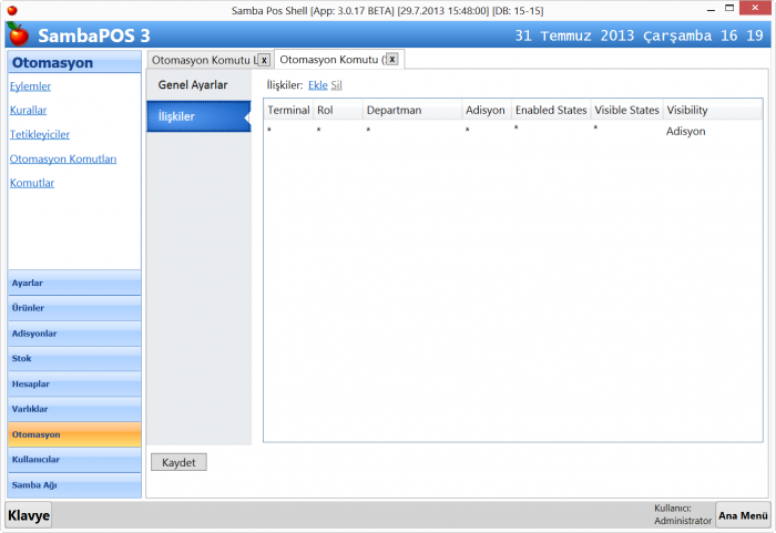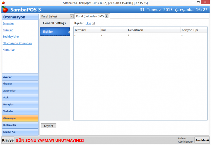 İlişkiler tabında bu kuralın hangi kullanıcı Rolundeki kişiler tarafından hangi Departmanlarda hangi terminallere çalışacağını belirledikten sonra işlemlerimizi tamamlamış oluyoruz.